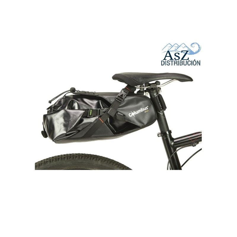 Bolsa de Sillín Estanca Con Arnés Columbus, es una bolsa ligera y con capacidad ajustable hasta 8l gracias al cierre enrollable y las cintas de compresión.