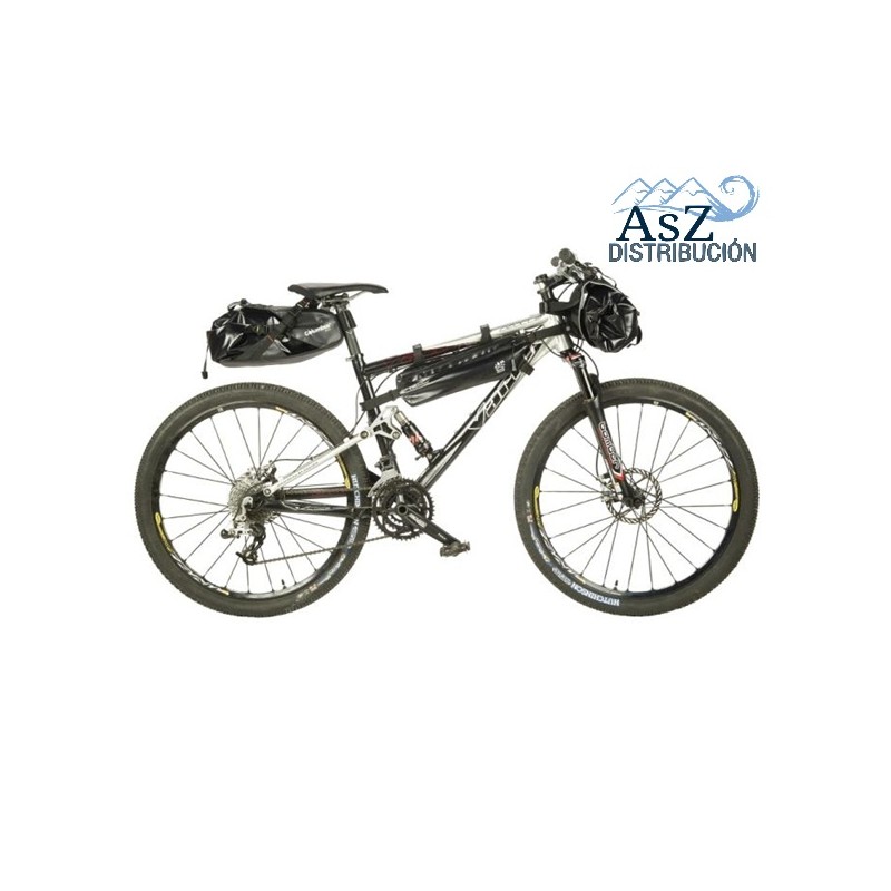 El arnés se fija a la tija con un velcro largo y al sillín con 2 cintas ajustables con hebillas. En su parte superior hay un cordón elástico ofrece almacenamiento adicional.