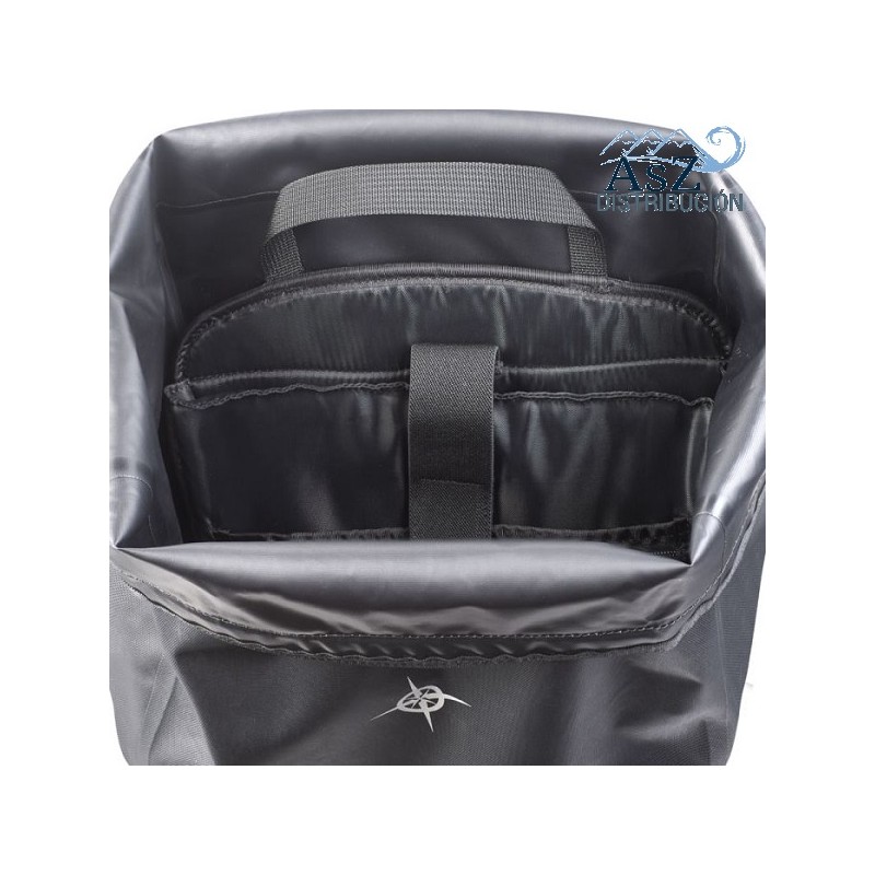 El sistema de cierre enrollable con hebillas laterales evita la entrada de agua. Es necesario enrollar la parte superior de la bolsa al menos 3 veces para una máxima eficiencia. Puedes expulsar el aire para compactarla gracias a su válvula.
