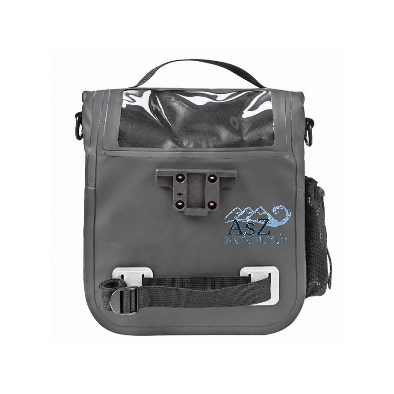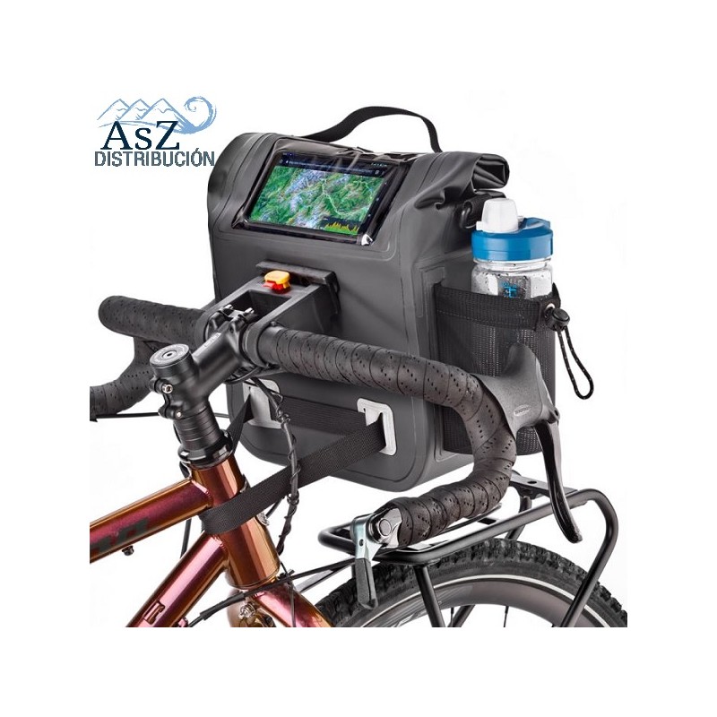 Bolsa estanca para sujetar al manillar. Estanca gracias a su cierre enrollable con correa central ajustable y sus costuras termosoldadas.