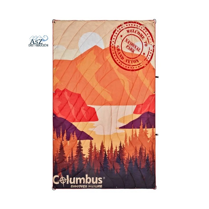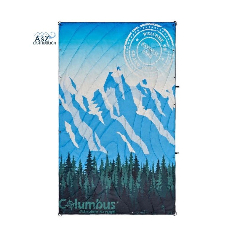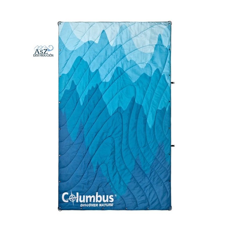 Manta de Viaje Grand Tetón Azul Columbus es la manta de acampada Grand Tetón es una manta ligera, cálida (relleno de fibra hueca de 200 g/m²) e impermeable, ideal para viajar en furgoneta o para acampar.