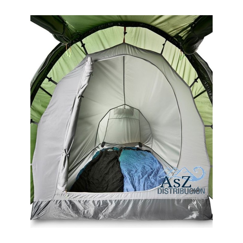 En la habitación, hay bolsillos laterales de malla, gancho para lámpara de camping y puerta interior con malla superior.