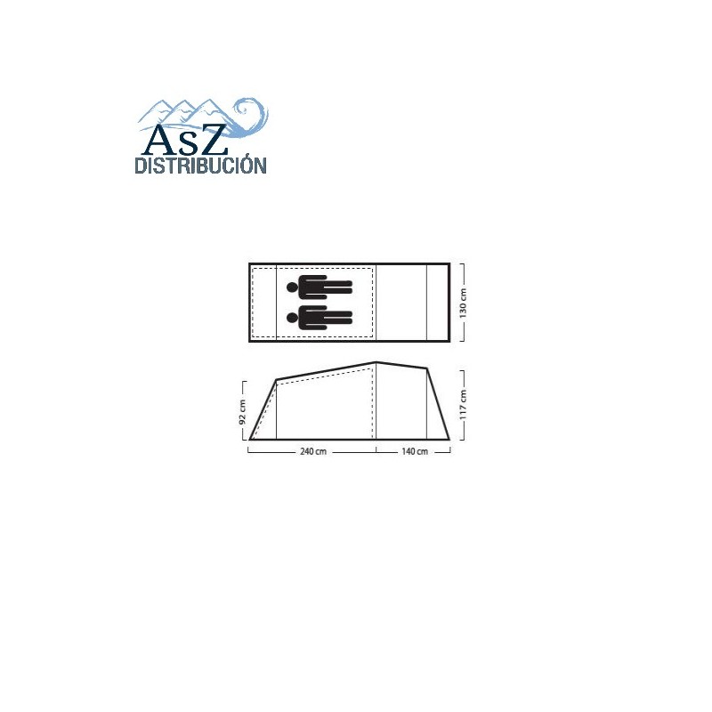 Las dimensiones de la tienda son 240 + 140x130 x117 / 92 (h) cm. y su peso es de 2,85 kg. Tamaño plegado en su bolsa de transporte: 45xØ15 cm