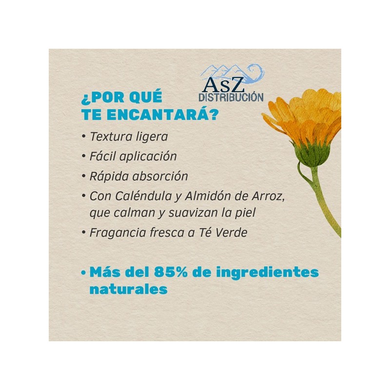 Ingredientes: Aqua, Oryza Sativa Starch, Triethyl Citrate, Cetearyl Alcohol, Propylene Glycol, Glyceryl Stearate Citrate, Zinc Ricinoleate, C10-18 Triglycerides, Ceteareth-20, Hydrogenated Olive Oil Unsaponifiables, Benzyl Alcohol, Glycerin, Parfum, Carbomer, Tocopherol, Glyceryl Laurate, Glycine Soja Oil, Hydrogenated Ethylhexyl Olivate, Calendula Officinalis Flower Extract, Potassium Sorbate, Sodiun Hydroxide, Sodium Benzoate, Citral, Citronellol, Geranyl Acetate, Hydroxycitronellal, Limonene, Linalool, Linalyl Acetate, Terpineol, Tetramethyl Acetyloctahydronaphthalenes.