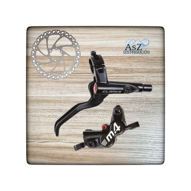 Frenos Clarks M4 Doble Pistón. - Freno de disco hidráulico por aceite mineral. - Abrazadera con bisagra para montaje fácil. - Maneta: aluminio. - Ajuste de distancia de maneta: con llave allen. - Pinza: aluminio. - 4 Pistones para una frenada potente. - Juego completo con dos discos de 160mm Delantero y trasero. - Longitud de los latiguillos: 81.5cm delantero / 166cm trasero.