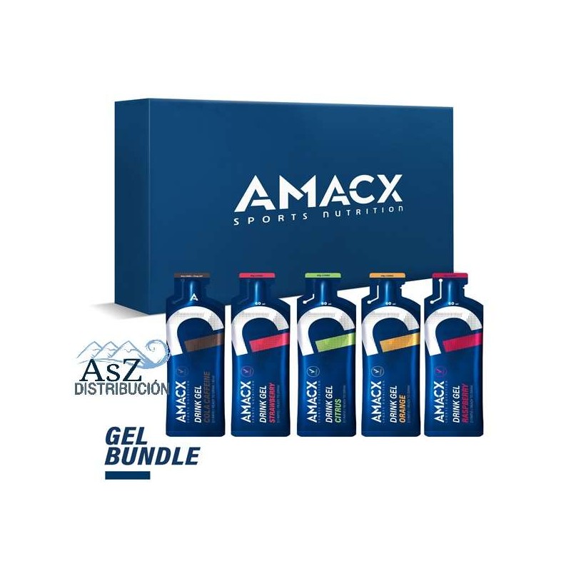 El Pack de 5 Geles contiene una unidad de cada sabor de los Energy Gel de AMACX: COLA-CAFEÍNA, FRESA, CÍTRICOS, NARANJA y FRAMBUESA.