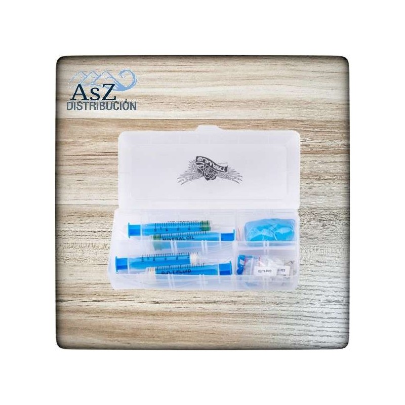 - Jeringas con émbolos de diferentes colores y claramente marcadas para aceite mineral y DOT para evitar confusiones.