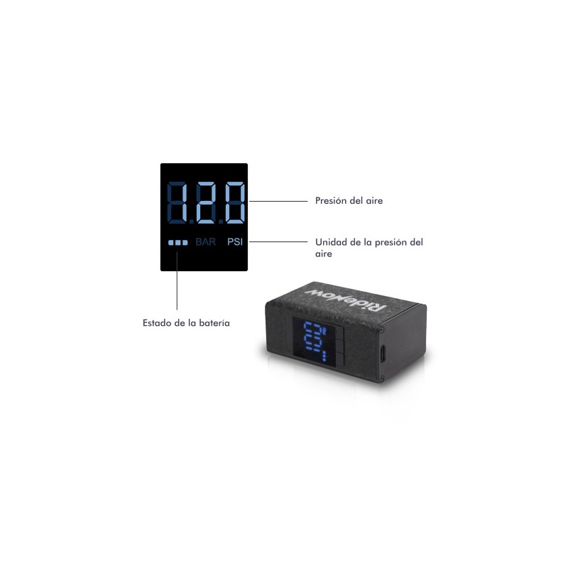 - Pantalla LED: La amplia pantalla LED proporciona una lectura clara de los niveles de presión y batería, facilitando el control durante el inflado.